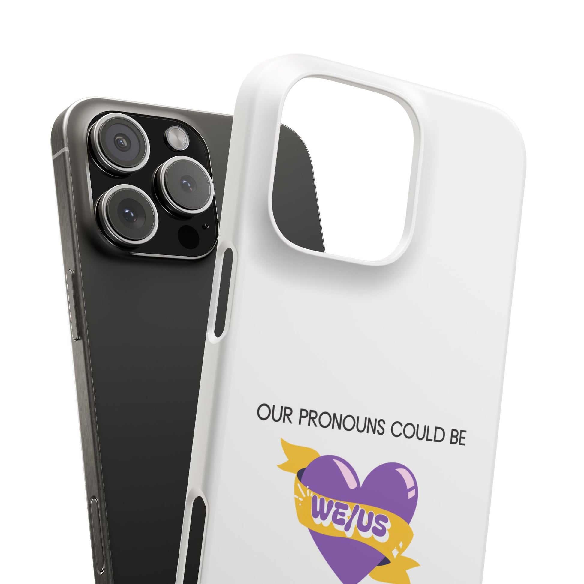Protect your device in style with Meltdownerz Our Pronouns Could Be We/Us 2 phone case. Made from durable 100% polycarbonate, it offers a sleek, lightweight design while keeping your phone safe from scratches and everyday wear. Our unique artwork is printed in vibrant detail on a smooth matte finish, making it as stylish as it is functional. Plus, it supports wireless charging for effortless connectivity.